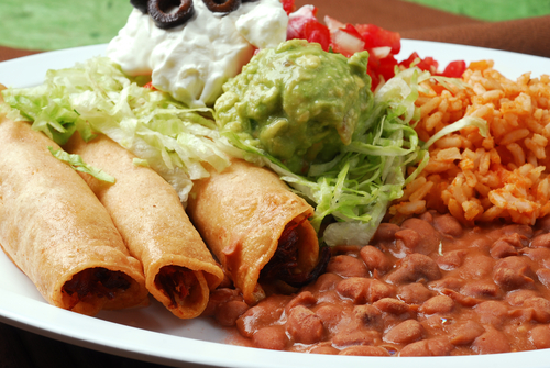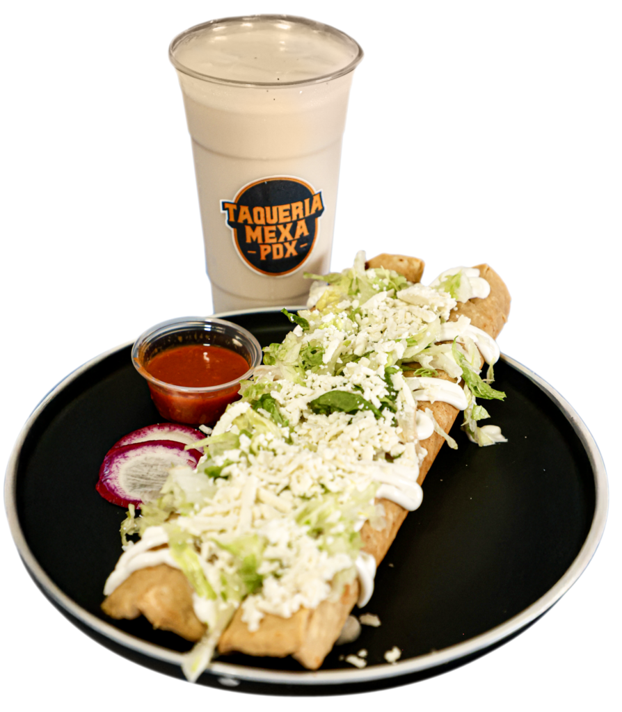 3 flautas rellenas de pollo o res, lechuga, crema, queso fresco y aguacate